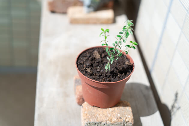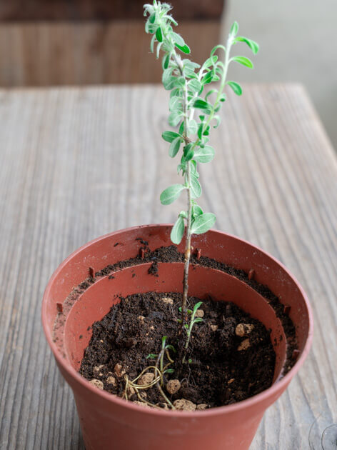 4月中旬、培養土に赤玉土を1割ほど混ぜて、小さな植木鉢に植え付けました。