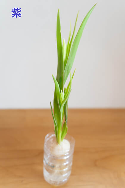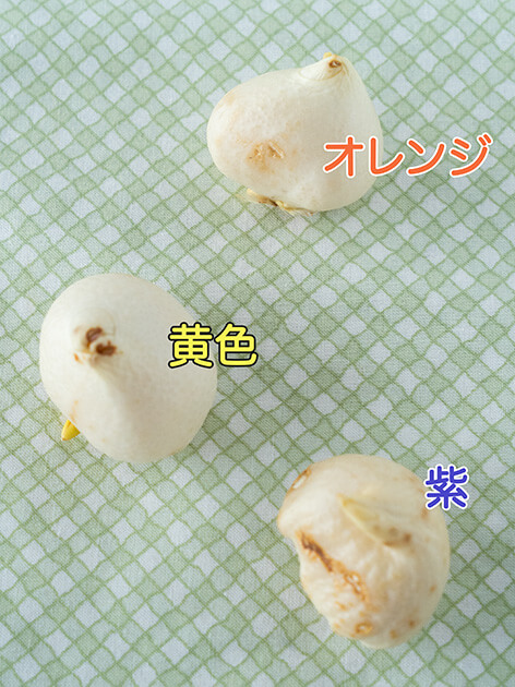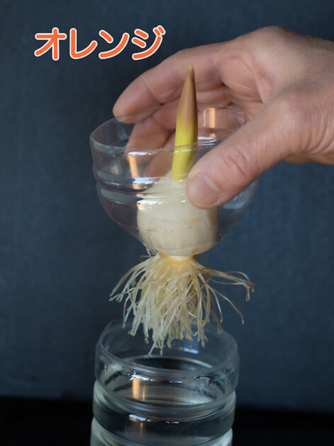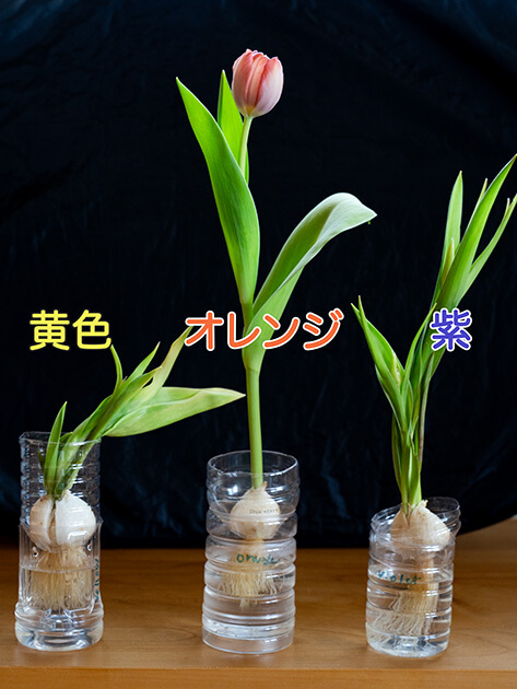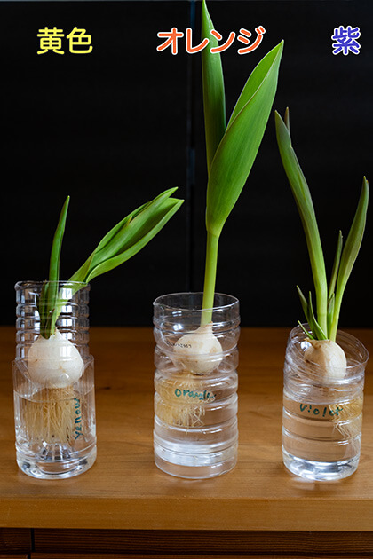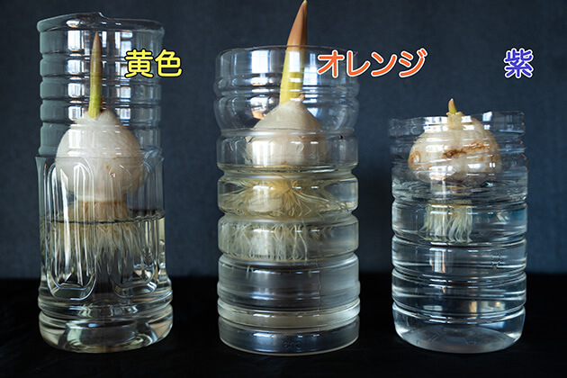 今年は、オレンジ、黄色、紫の3つの球根を水栽培しました。