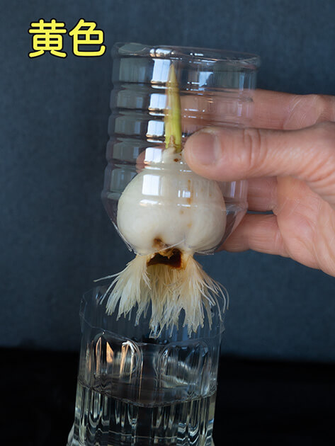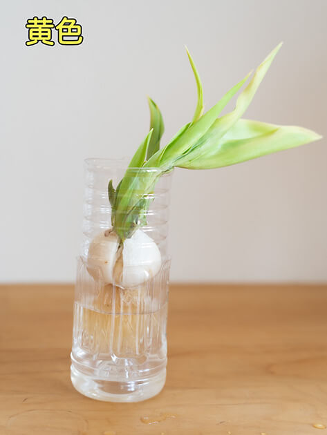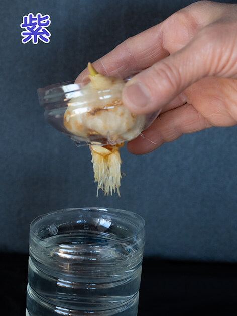 | 1月:根を張らせる | 球根を冷蔵庫から出す。茶色い外皮をむき、分球している部分は取り除いて、水を入れた容器へ。玄関に置く。 | 適温 5〜15℃ |