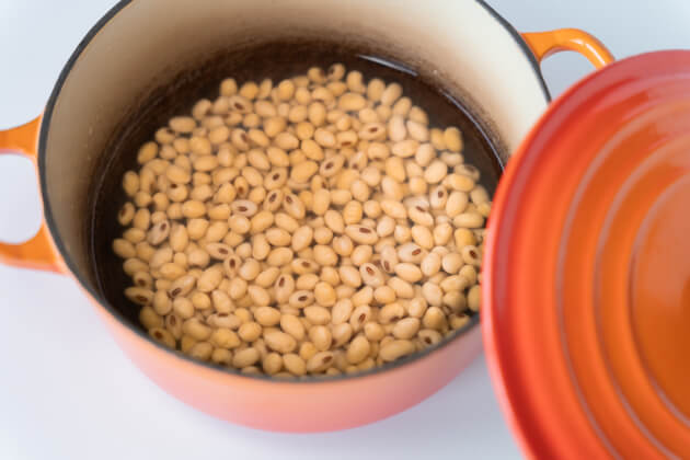 - 乾燥大豆をお鍋にいれ、豆がヒタヒタにつかる程度の水を注ぐ