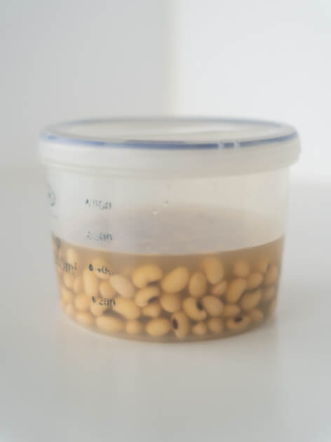 大豆が水を吸ってぷっくりふくらみました。