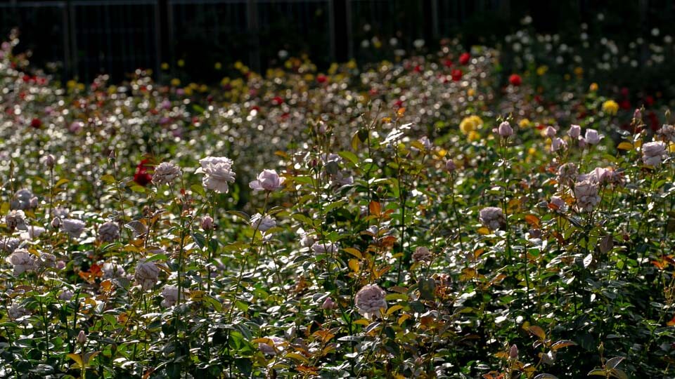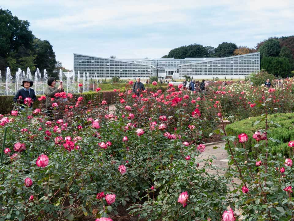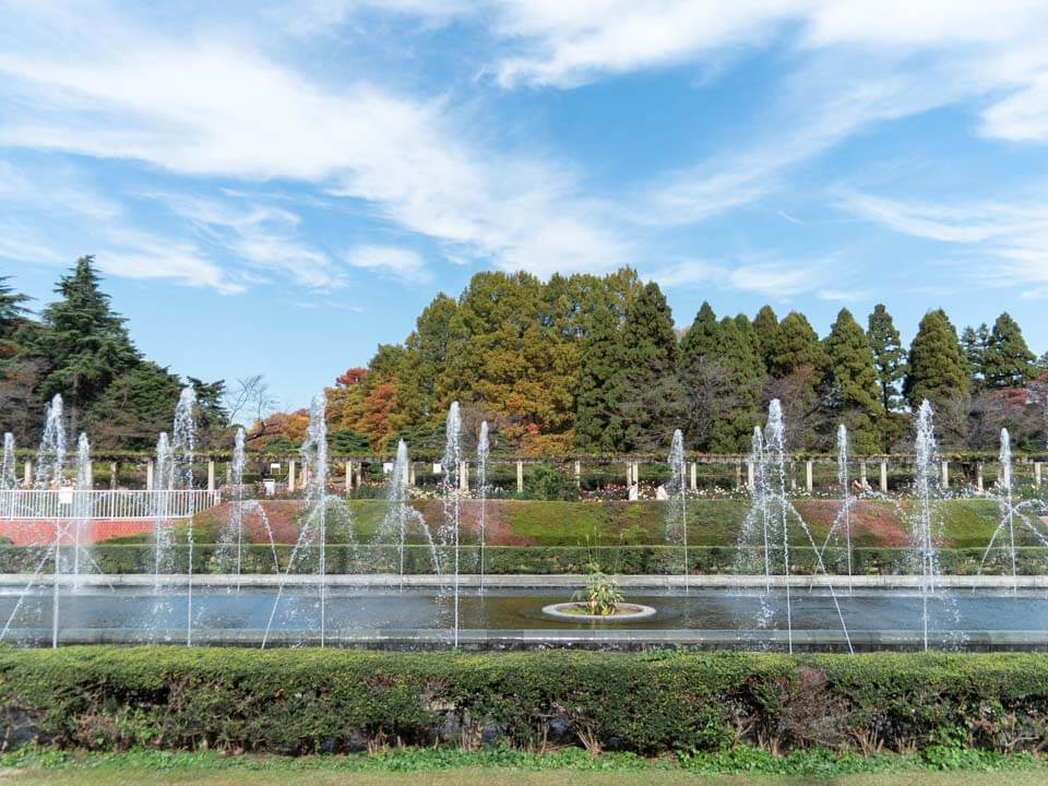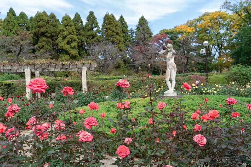 公園の中心にあるバラ園は、噴水を取り囲んで左右対称に花壇が広がる西洋庭園。約400種・5200本のバラが栽培されていて、秋咲きのバラはまさに見ごろ。