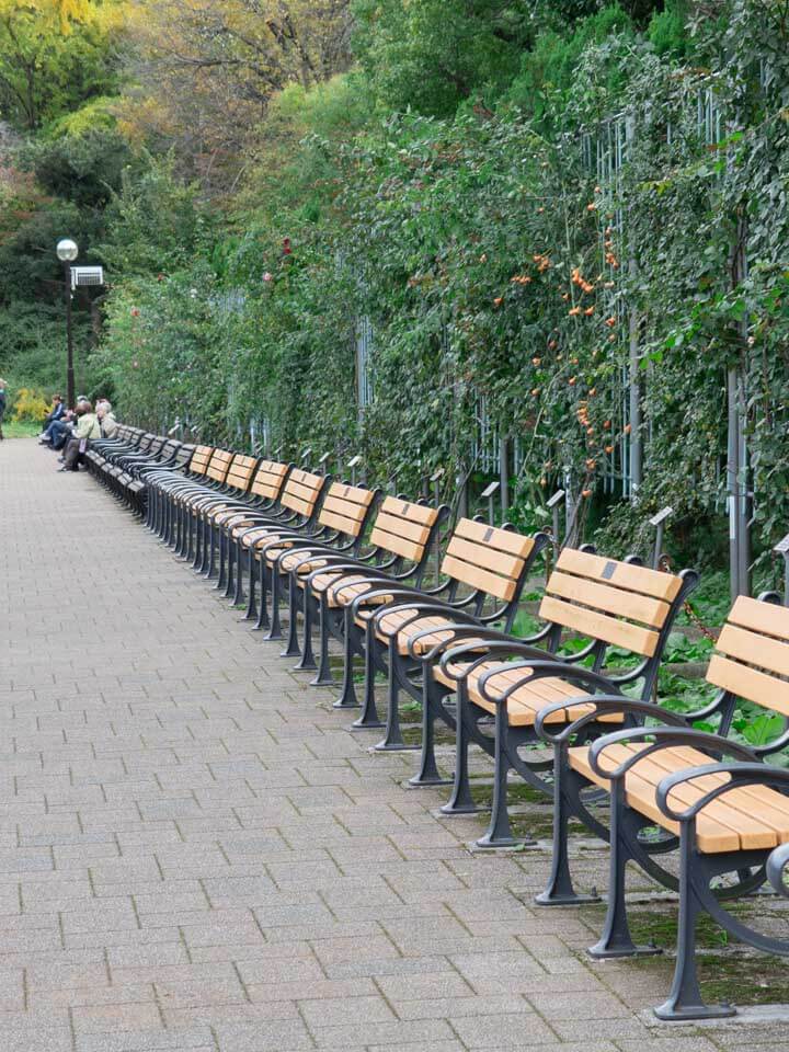 バラ園と並行にベンチがずら〜っと整列。疲れたらいつでも腰掛けてゆっくり花を眺められます。