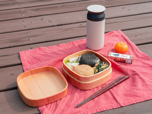 芝生広場のベンチでお昼休憩。床机のように四角いベンチは、お弁当を広げるのに便利。
