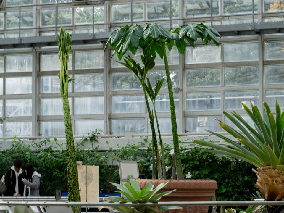 大温室に足を伸ばすと、スイレン池のほとりに世界最大の花・ショクダイオオコンニャクが3株も栽培されてた!