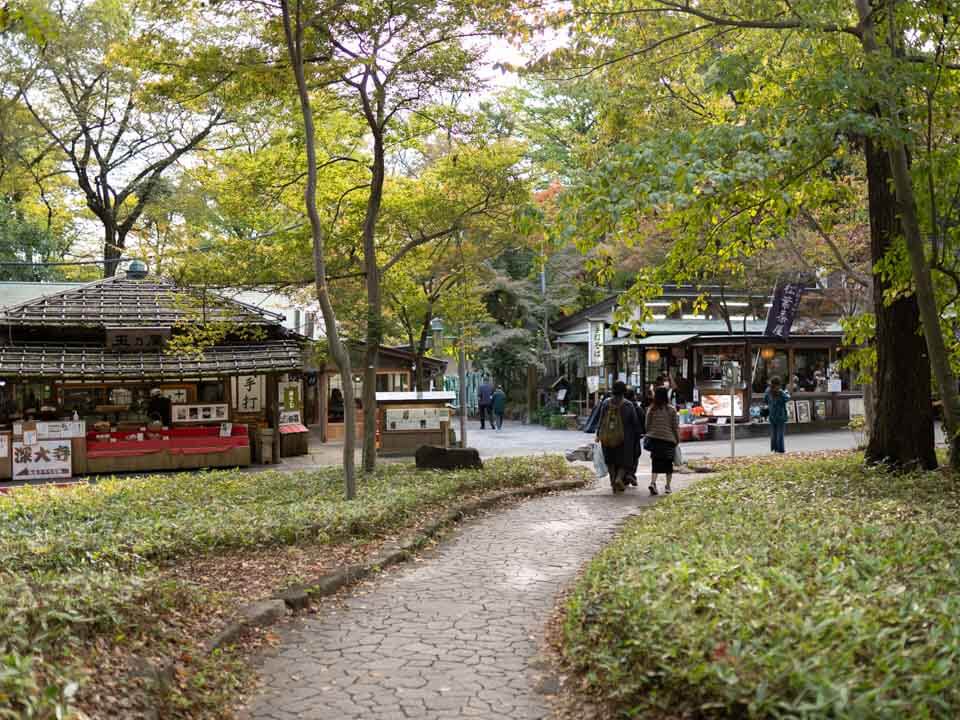 森の道を通ってお隣の名刹・深大寺と行き来ができます。参道には名物のお蕎麦屋さんが軒を連ねて、ちょっと江戸時代にタイムスリップしたみたい。
