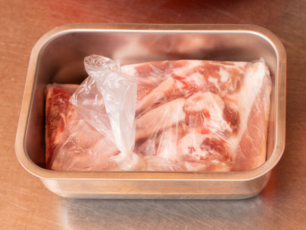 - 肉に粗塩をすりこみビニール袋へ。冷蔵庫で2日間寝かせる
