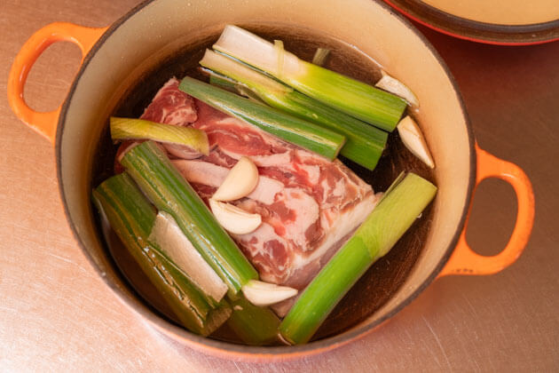 お肉をお鍋へ。ヒタヒタに水を入れて、青ネギ、ニンニク、昆布を投入。