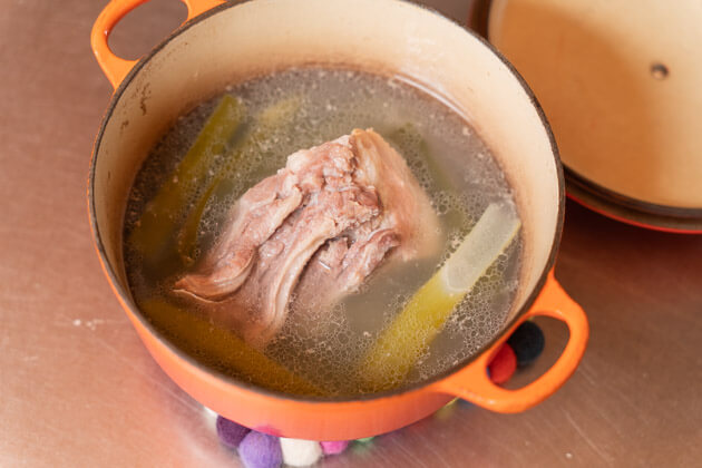 - 沸騰したら最小の弱火で45分、アクを取りつつコトコト煮る