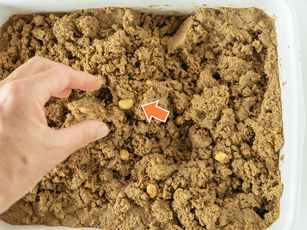 大豆の掘り出しは、ぬかを混ぜる時。目についた豆を適当につまみ出すだけ。