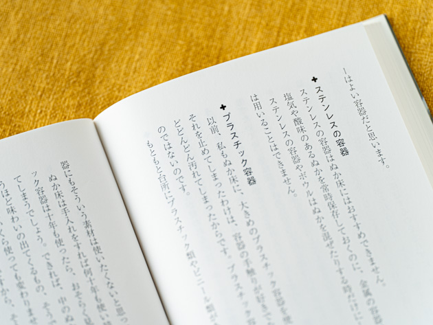 ぬか床は自分の体みたいなものだと思います。日々ちゃんとした食事をとったり、なるべく運動を欠かさないように心がければ、健康な自分をキープできます。(中略)ぬか床もそれとまったく同じです。(中略)小さなことを欠かさず繰り返すことで、はじめて結果が出る。だから、私のぬか床は私自身なのだといつも思います。