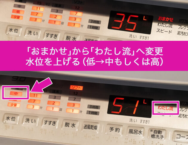 洗濯物の量にもよるけど、ちょっと量が多いな〜という時は、思い切って水位を一番上の「高」に上げるとさらに効果あり。