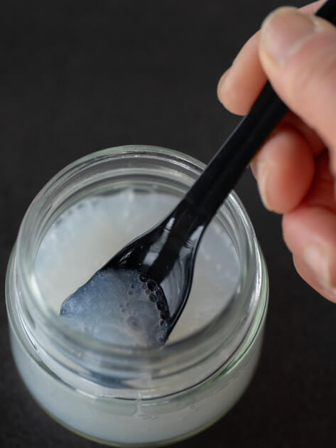 容器に粉石鹸と40〜50℃のお湯を1:10の割合で入れて良く混ぜ、約3時間放置すると、トロトロのゼリー状に。