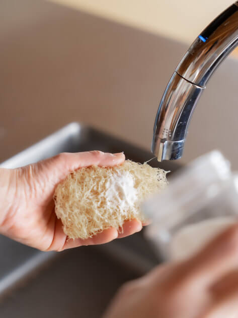 普段の食器洗いは、サラサラの粉石鹸をそのままスポンジに振りかけて泡立てて。頑固な汚れには粉石鹸とお湯を1:10の割合でよく混ぜ、3時間ほど放置して作るトロトロ石鹸を。