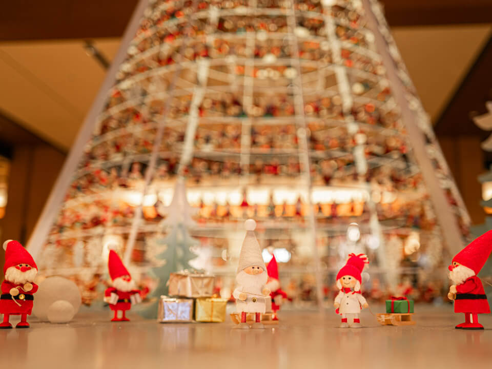 4層吹き抜けの空間、ガレリアには高さ約 4m の「サンタツリー」のディスプレイ。小さなサンタさんたちがプレゼントを準備したり、トナカイのお世話をしたり、今にも動き出しそう。