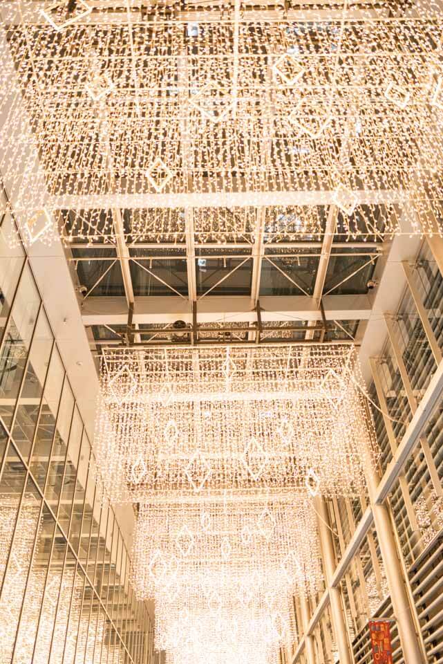 ビル横の屋外スペースにシックなクリスマスツリー。光の回廊が続いてます。
