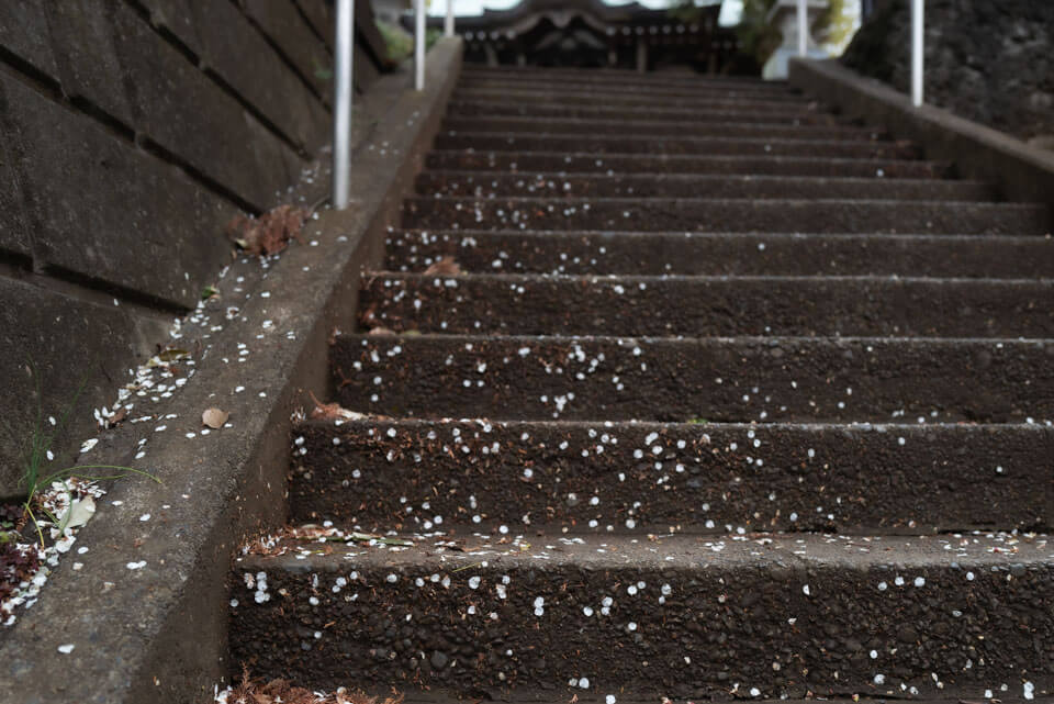 3月。石段に散った梅の花びらも、もう少しすれば消えてしまう。