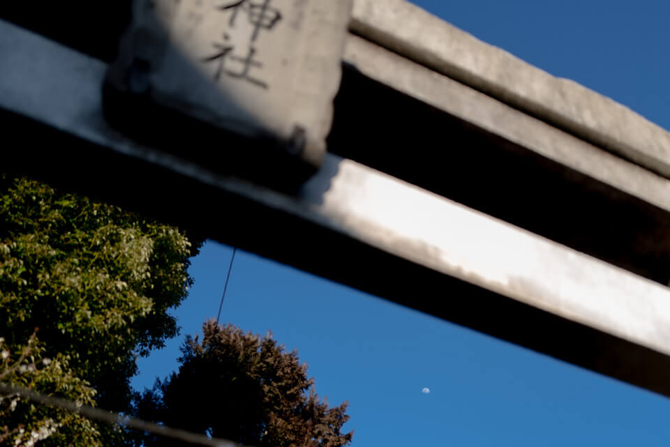 鳥居の向こうに、小さな白い半月を見つけました。見えるかな?