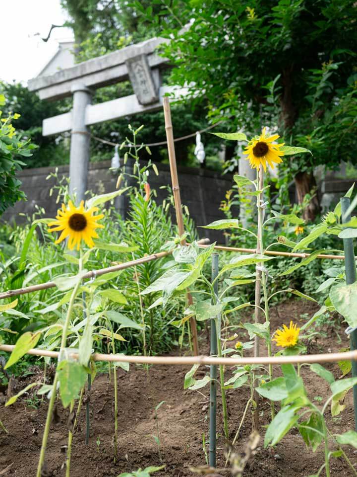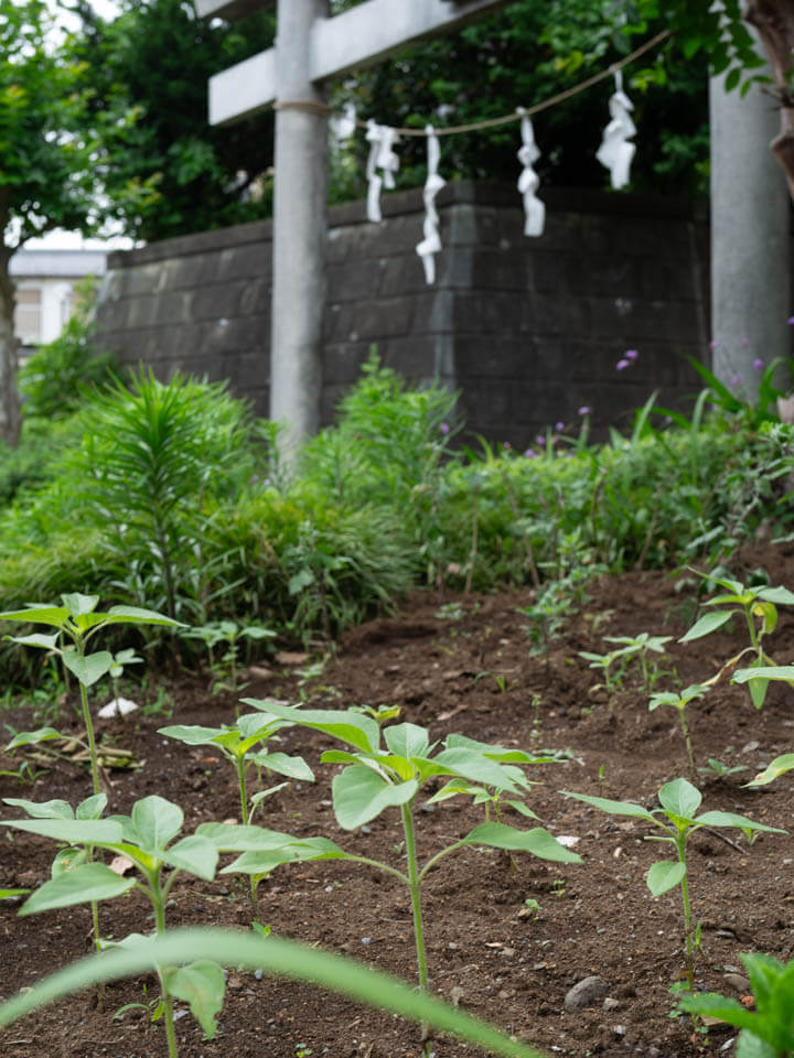 参道の両脇にある花壇では、ひまわりの芽がぐんぐん育っていました。町の人たちが、四季折々手入れしている花壇。