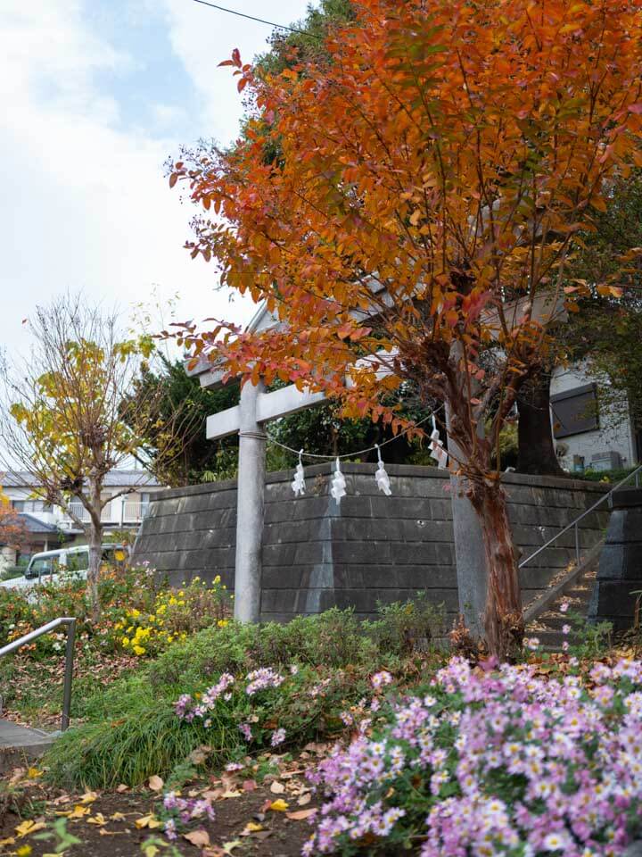 参道のサルスベリの葉が鮮やかに色づき、花壇の菊もかわいらしい花を咲かせてる。冬が来る前のひと時。