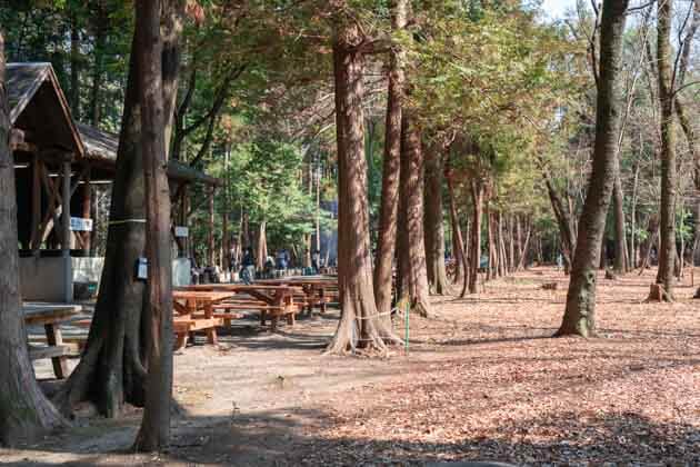 民家園を後にして、木道の階段を上ると広々した日帰りのキャンプ場が。この日も家族連れがバーベキューを楽しんでました。