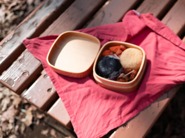 ワタクシは、キャンプ場を眺めながら森のベンチでお昼ご飯を。