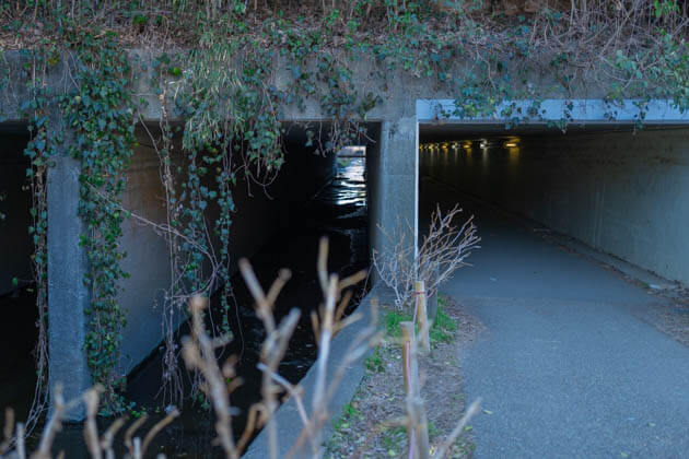 しばらく歩くと、川と並行に鬱蒼とした歩行者用トンネルが出現。
